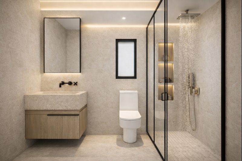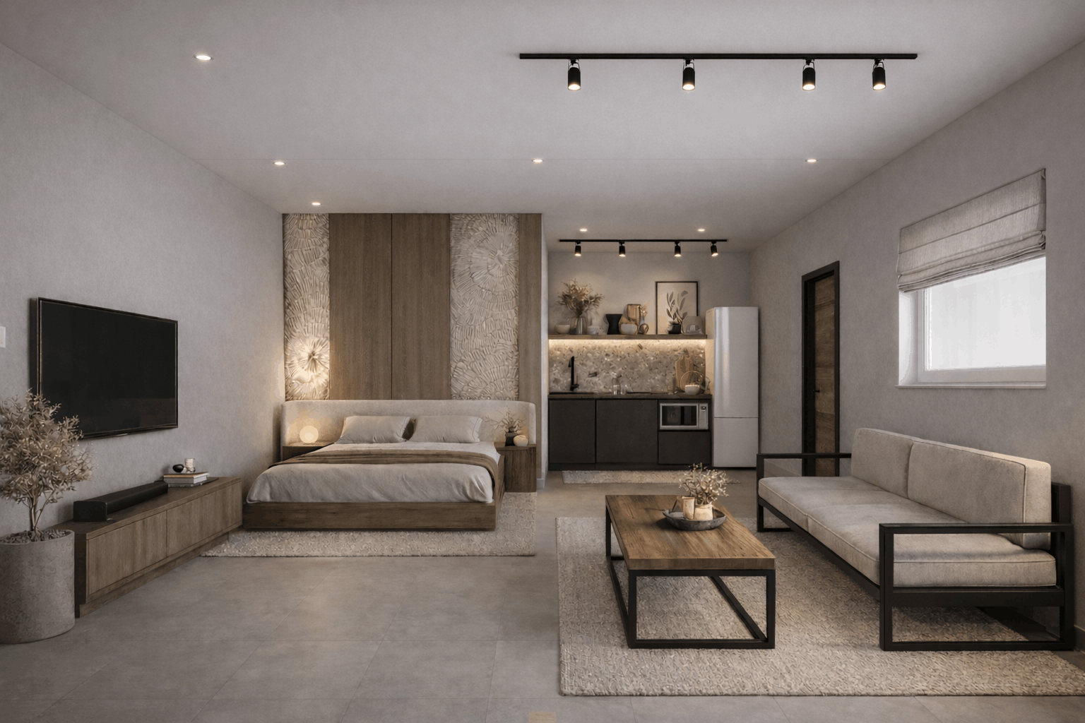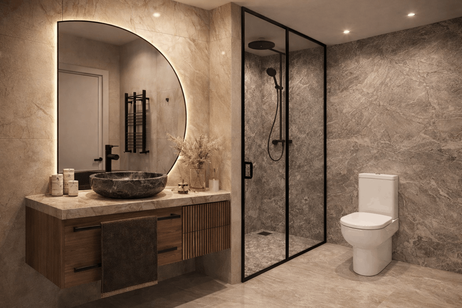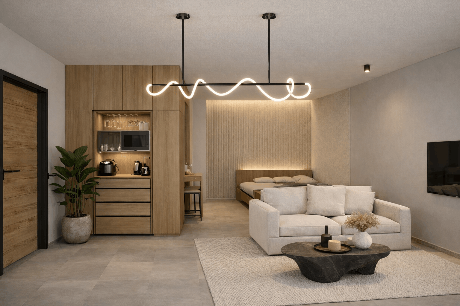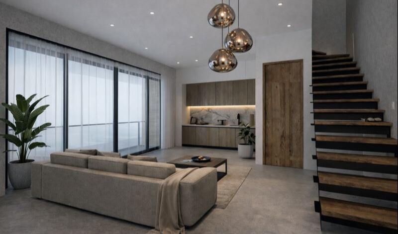 The photorealistic interiors reveal a cohesive world of warm neutrals, natural textures, and soft, architectural lighting. Stone, wood, and tactile surfaces create a sense of balance and ease, while clean lines and carefully framed details allow the spaces to breathe. Bathrooms are conceived as serene retreats, bedrooms feel grounded and intimate, and the living areas flow effortlessly between comfort and clarity.
