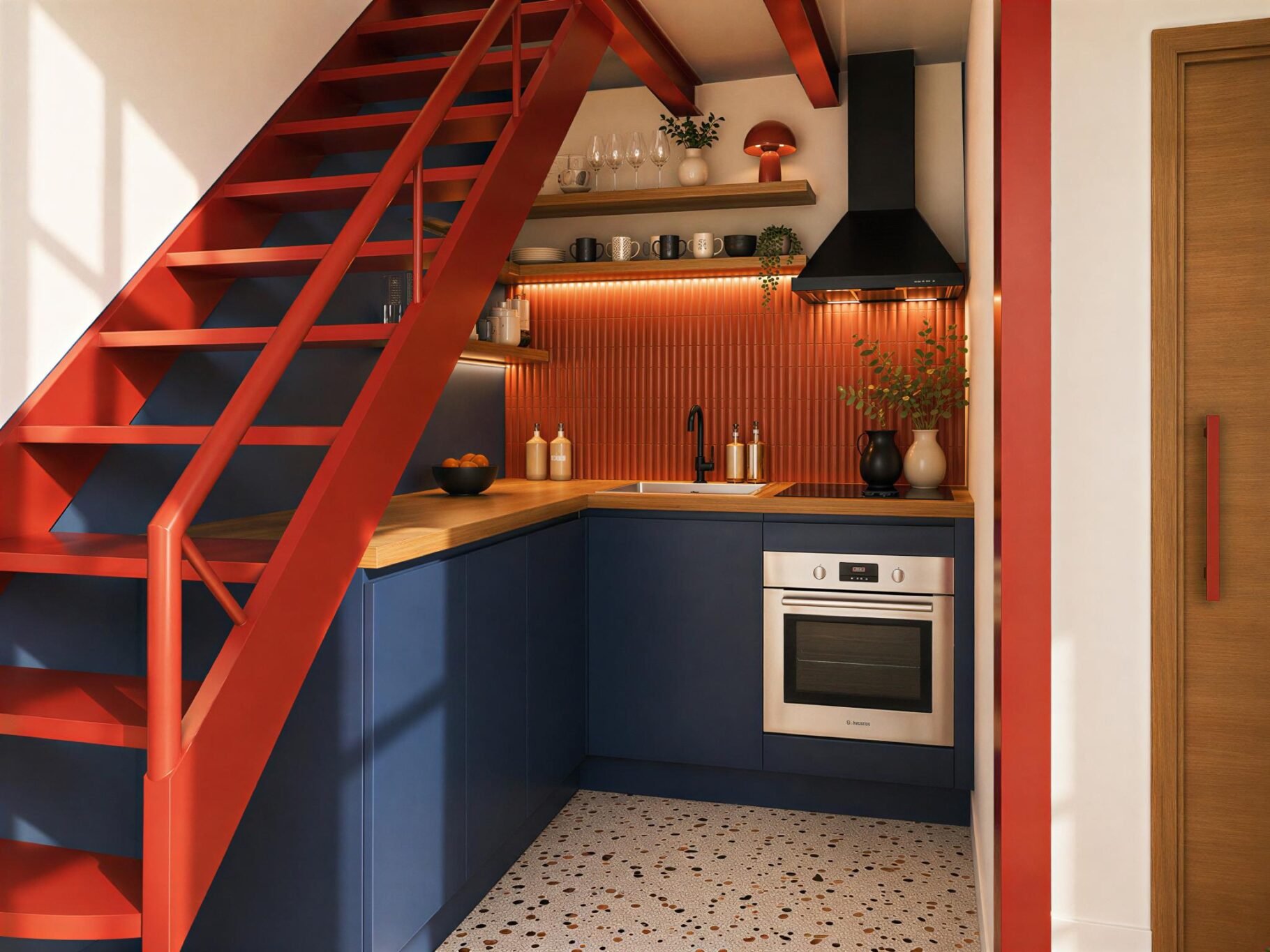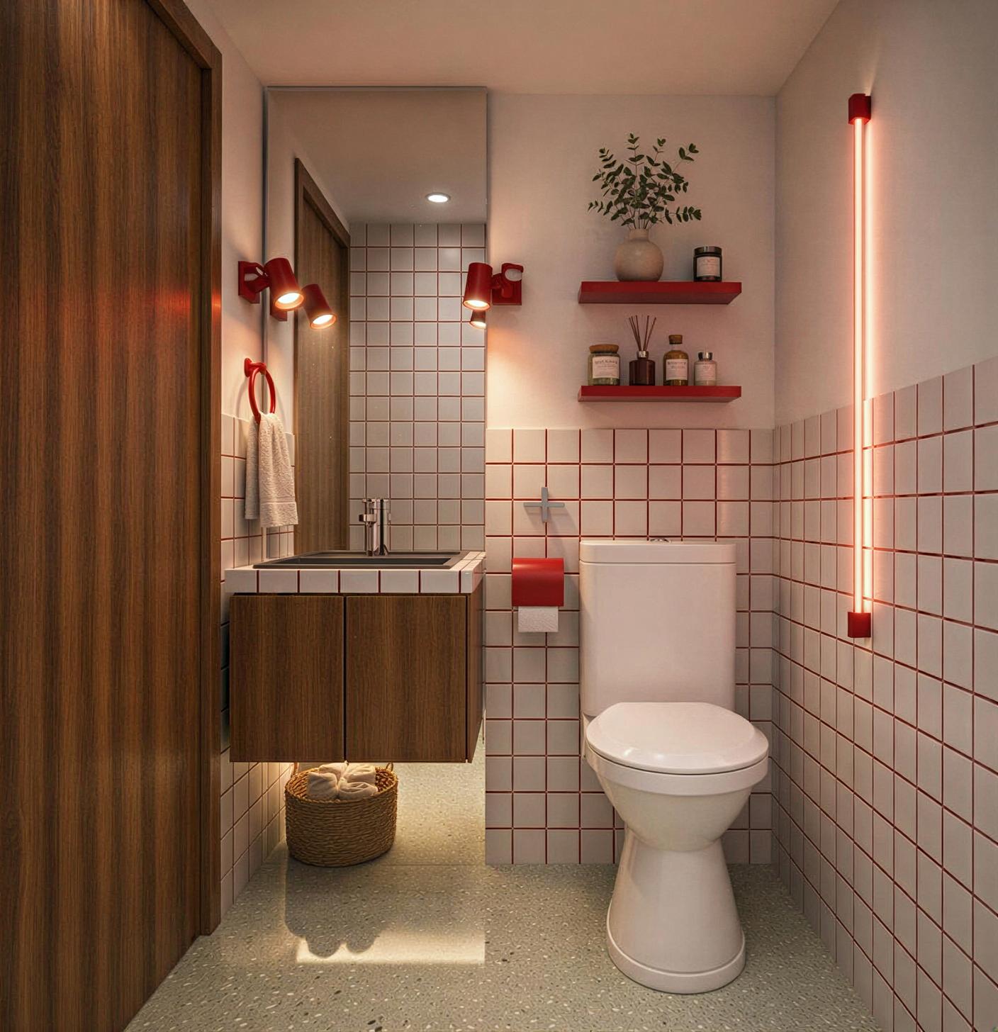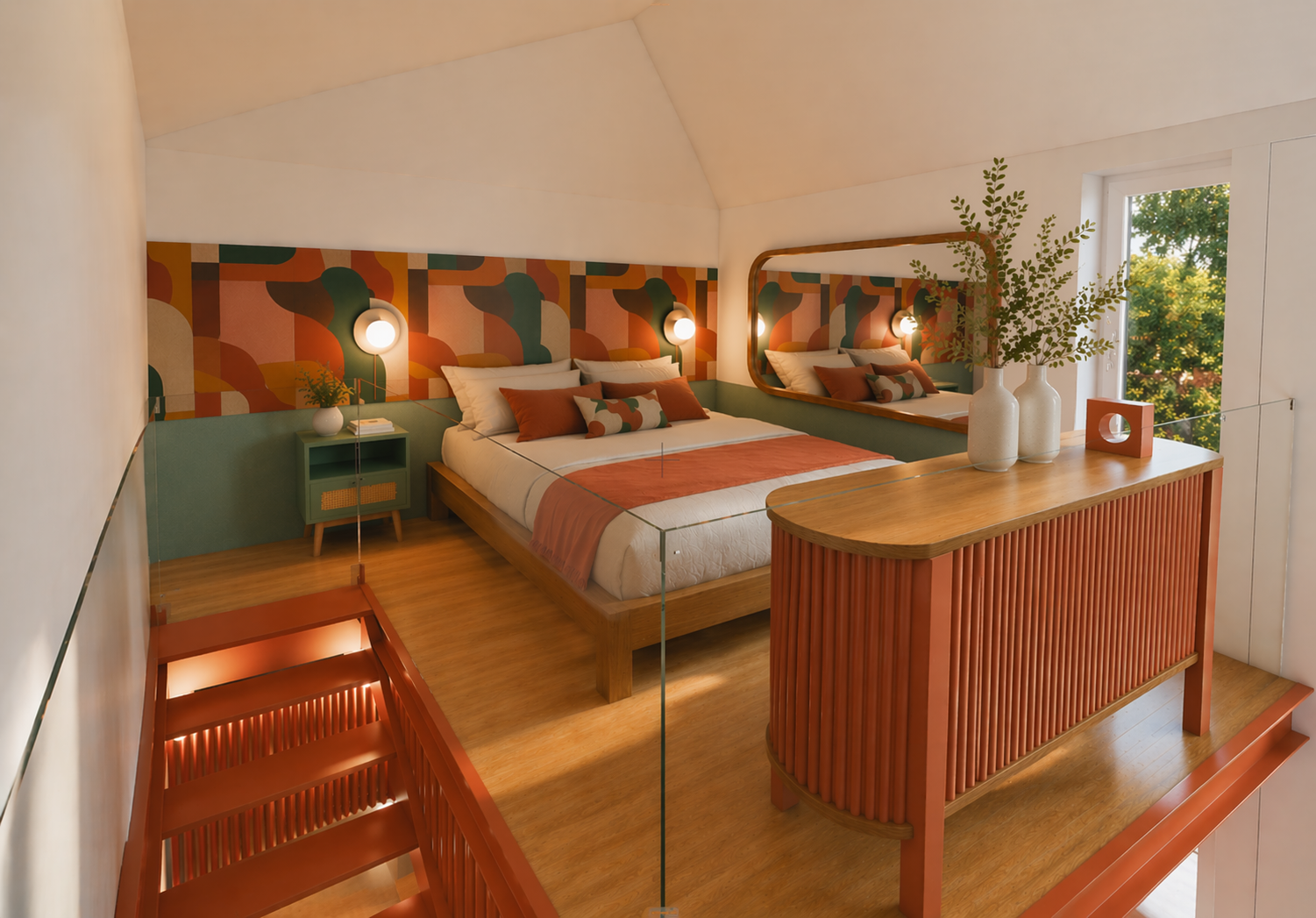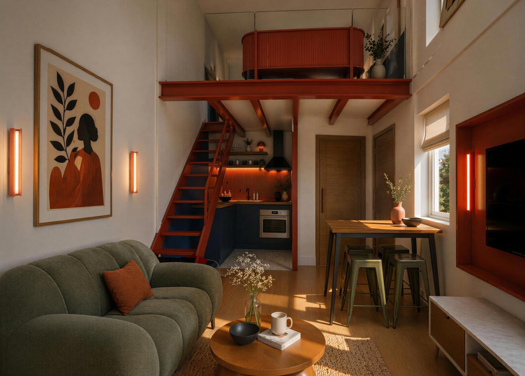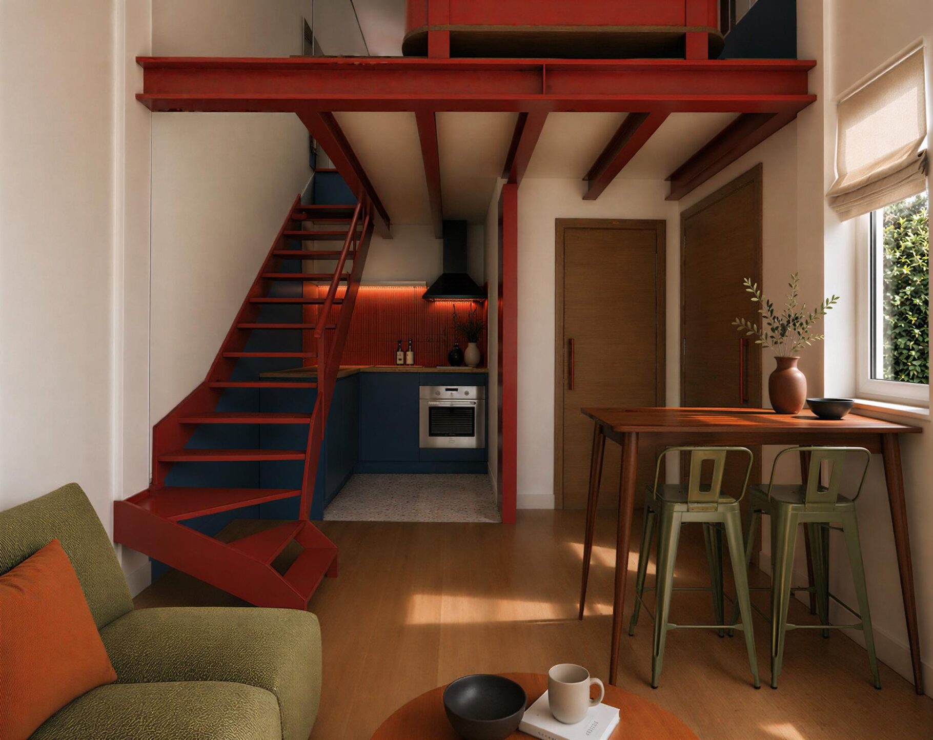 A compact apartment where architecture becomes an active design element, defined by a bold red steel structure that organizes space and circulation.The double-height living area maximizes light and openness, balanced by warm wood surfaces and carefully selected furnishings.A sculptural staircase leads to a mezzanine bedroom, where softer tones and graphic elements create a more intimate atmosphere.The kitchen and bathrooms maintain a cohesive material palette, combining color contrasts with refined detailing.Overall, the project transforms limited space into a layered, expressive environment that feels both functional and visually distinctive.