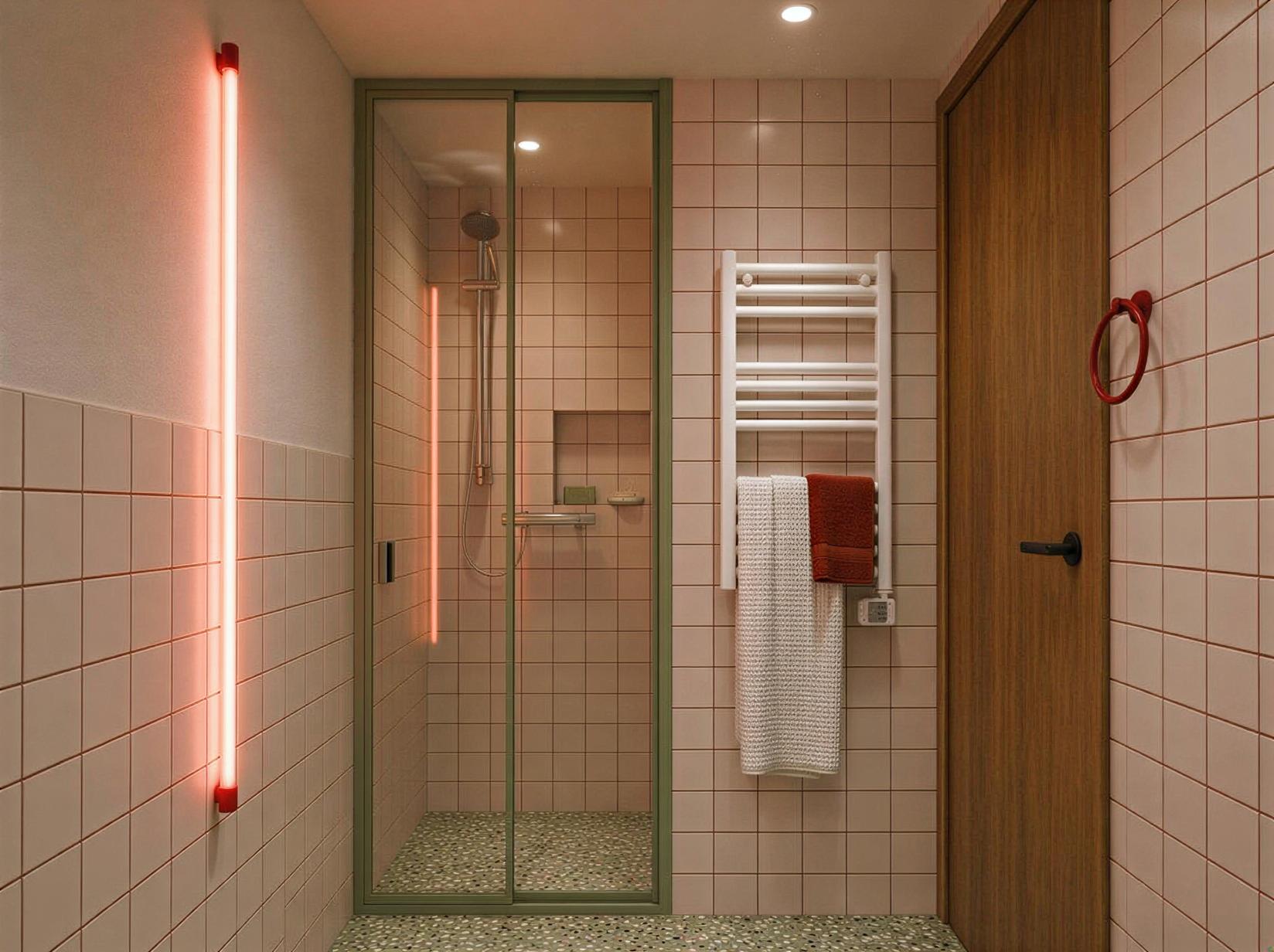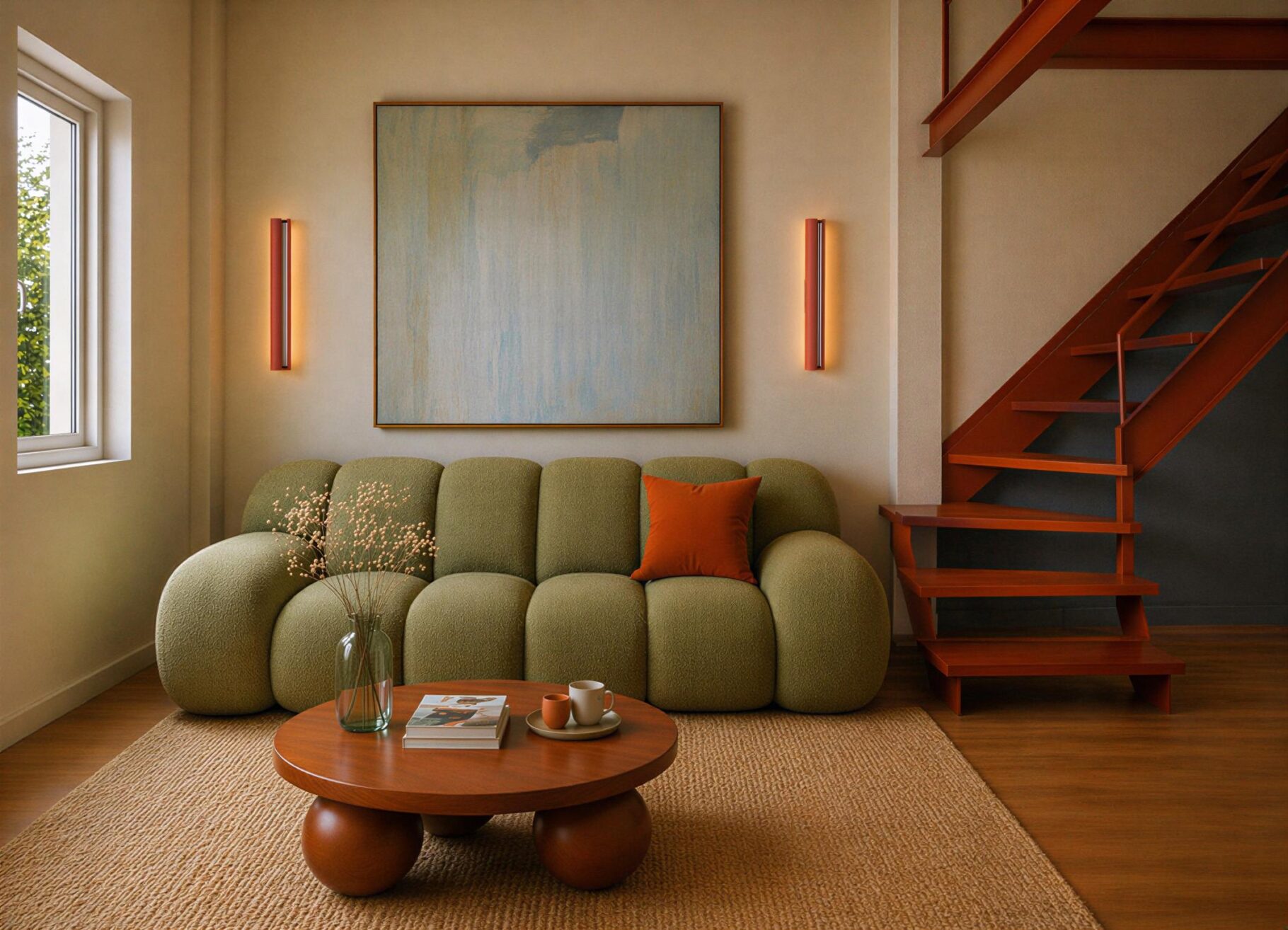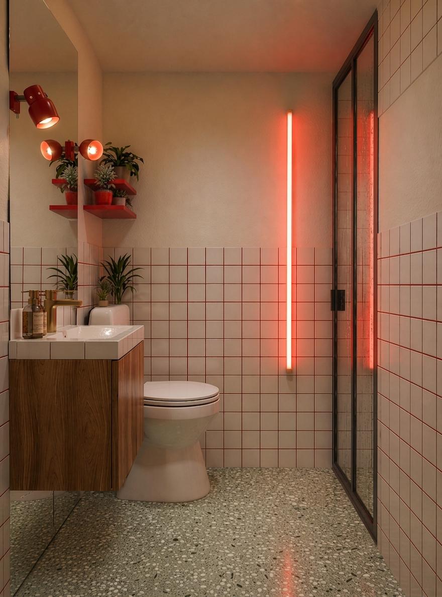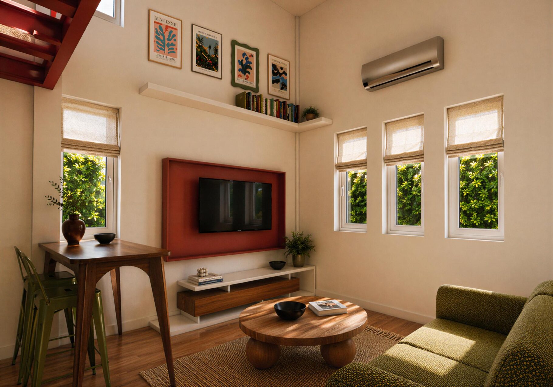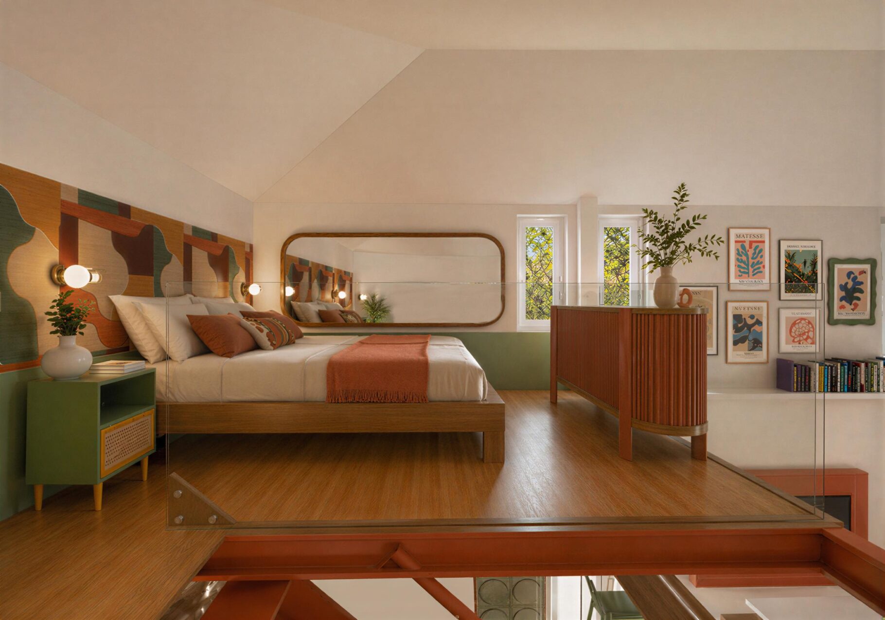 A compact apartment where architecture becomes an active design element, defined by a bold red steel structure that organizes space and circulation.The double-height living area maximizes light and openness, balanced by warm wood surfaces and carefully selected furnishings.A sculptural staircase leads to a mezzanine bedroom, where softer tones and graphic elements create a more intimate atmosphere.The kitchen and bathrooms maintain a cohesive material palette, combining color contrasts with refined detailing.Overall, the project transforms limited space into a layered, expressive environment that feels both functional and visually distinctive.